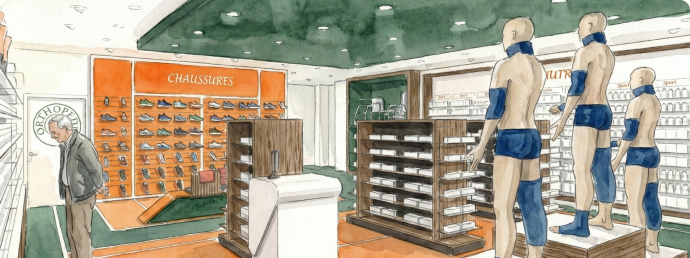 100m² dédiés à l’orthopédie et au sport. Chaussures, semelles, contention : prise en charge par un orthoprothésiste et des pharmaciens spécialisés.